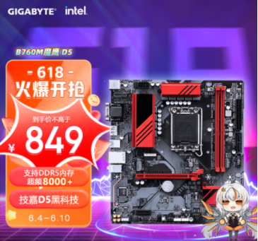 想要一键触达DDR5 8000MHz又想省钱买主板?技嘉B760M魔鹰主板一定不要错过。作为技嘉为十三代酷睿打造的入门级DDR5主板之一,618年中钜惠活动期间仅需849元可叠加优惠,性价比爆表!并且这款主板同样支持D5内存黑科技提供双M.2插槽和USB3.2接口以及3个视频输出接口(DP、HDMI、DVI),并另外单独有WIFI蓝牙版本可选。功能齐全又不贵,内存超频很给力,技嘉B760M魔鹰可谓麻雀虽小五脏俱全,强烈推荐。购买链接:https://item.jd.com/100045464202.html#crumb-wrap