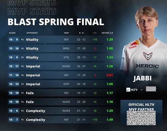 随着Heroic在总决赛中2-1击败Vitality,HLTV随之也公布了本届赛事的MVP,来自丹麦的小将jabbi赢得了自己职业生涯中的首枚MVP奖章。