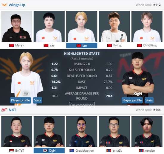 挑战组中第二名晋级的WingsUp在RA、LVG、NKT的三选一中选择了较有把握对抗的NKT。在flying加入后,WingsUp的火力确实有了不小的提升,而队内的狙击手lan最近状态也十分火热。虽然在挑战组的比赛中不敌CR.G屈居第二,但在不久前也曾与TheMongolz、LVG等队伍打的难舍难分,实力提升显而易见。
