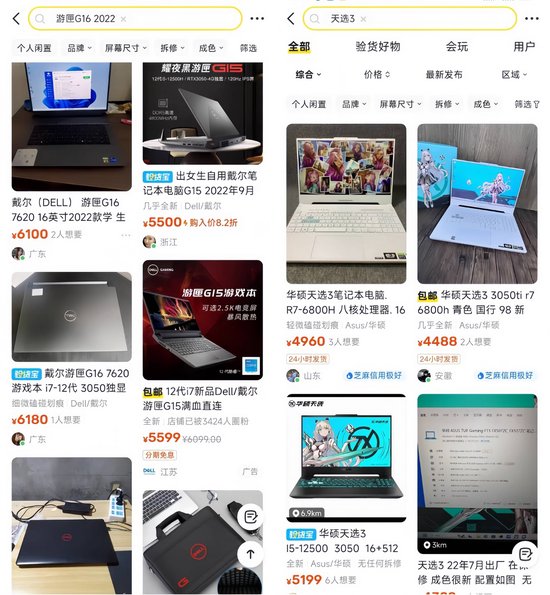 在硬件、性能之外,“保值率”也成为大家挑选游戏本所关注的热门话题,最显著的变化是近两年来各品牌、各渠道都在大促活动中推出了“价保”机制,减少消费者对价格变动的疑虑。保值率最直观的体现,毫无疑问是在二手价格上。以去年发布的热门游戏本为例,天选3(6800H+3060)首发价7499元,目前二手价约4800元上下,保值率只有64%左右;游匣G16(12700H+RTX 3060),首发价9999元,现二手价约6000元,保值率勉强达到60%。