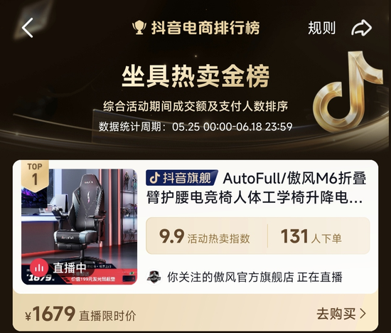 抖音榜单显示,傲风四向护腰电竞椅——傲风M6电竞椅,高居抖音坐具热卖金榜·Top1;