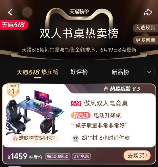 天猫榜单显示,傲风超大桌面电竞桌——傲风A4电竞桌系列,高居天猫双人书桌热销榜·Top1;