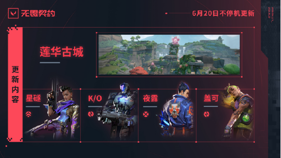 在新版本中,新英雄——夜露(决斗),K/O(先锋),盖可(先锋),星礈(控场)加入游戏,同时东方韵味的新地图莲华古城也已加入游戏各大匹配模式的对战当中。