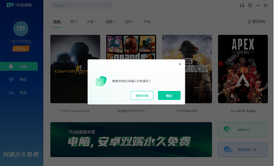 这款加速器叫做TM加速器,它不仅电脑端上免费加速器,手机端上也一样免费加速。电脑端玩蓝色协议、暗黑4以及APEX这些游戏,延迟普通很低,稳定在40ms左右。TM加速器电脑端除了高峰期外,可能会出现排队的情况,其他时候都是免费加速。