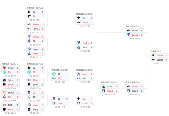 现在来看看TI赛事赛制,以TI11为例子,一共有20支队伍参赛。赛事也分为小组赛阶段和淘汰赛阶段,不同的是没有队伍可以直接越过小组赛,获得淘汰赛的名额。20支队伍会被分配到A、B两组中,进行B2积分循环赛。根据积分排名,每组前四名可以晋级淘汰赛胜者组,5~8进入败者组。
