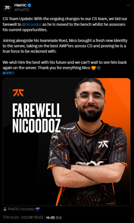 “CS阵容更新:根据我们CS分部的阵容调整,我们要和nicoodoz说再见了,我们在对他进行评估后,最终决定下放他。”