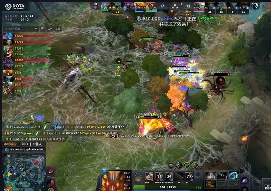 17分钟Liquid白牛定位蜘蛛和队友将蜘蛛击杀,随后Liquid控下一代肉山,拉席克带盾推上路一塔,而蜘蛛顶线引发团战,白牛狼人直接冲,但是蜘蛛爬到二塔,凤凰变蛋,此时PSG.LGD的獸和猴子切入,尸王和白牛被A杖散失的猴子切死,拉席克被蜘蛛打的交盾,随后PSG.LGD的猴子残局如入无人之境,Liquid被猴子陆续收割打至团灭。