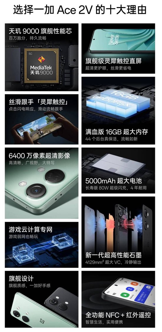 一加 Ace 2V 搭载联发科天玑 9000 旗舰芯片。天玑9000拥有强劲性能与出色能效,配合丰富的游戏技术,为玩家的游戏体验带来全面提升。一加Ace 2V还可配置满血版16GB超大内存,LPDDR5X配合内存基因重组技术,可实现应用“秒启动”,让给用户长久使用也稳定畅快。