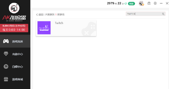 首先,打开并运行AK加速器。在加速器中搜索并选择 "Twitch",点击加速完成。