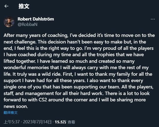“在多年的执教之后,我觉得是时候迎接新的挑战了。做出这个决定并不容易,但我感觉时机已到。我为执教期间共事的选手和一起捧起的冠军奖杯而骄傲。我从中学到了很多,和他们一起拥有许多美妙的回忆。余生我会带着这些记忆继续前行。这是一段疯狂的旅程。首先我想感谢家人这些年来对我的支持,我也像感谢支持我们战队的每一个人。感谢所有选手、工作人员、管理层的努力工作。如今CS2近在眼前,不久后我会公布更多讯息。”
