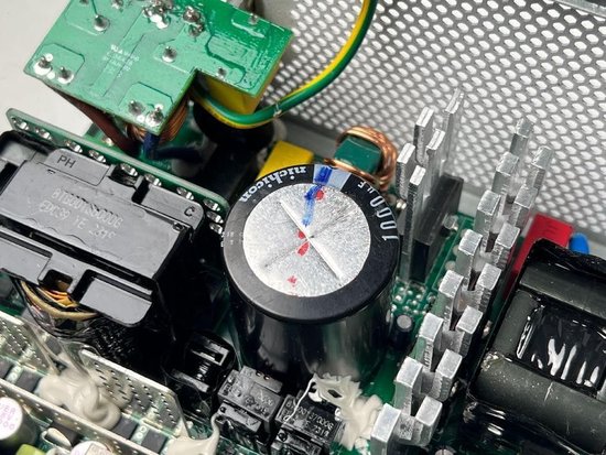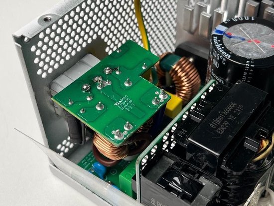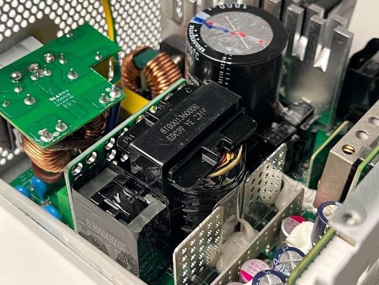 电源的内部较为紧凑,首先是电源输入口的内侧,网格状PCB散热背板的另一侧,为电源的一级EMI电路。