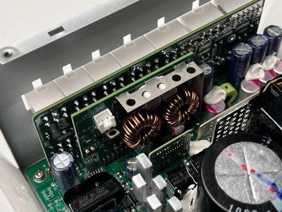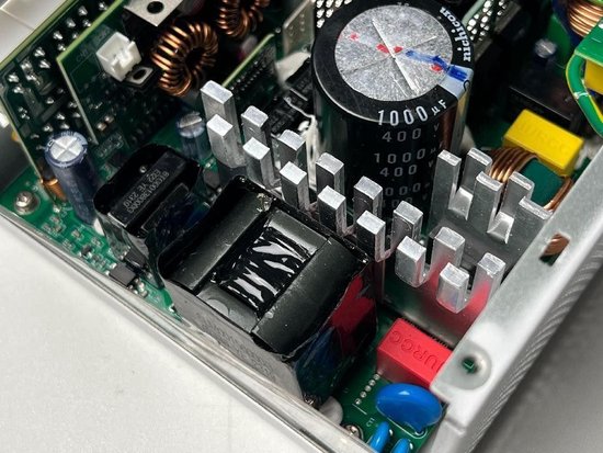 往下走我们可以看到电源搭配的全桥LLC谐振电路,内测装载了两片金属散热片来保证电路工作时的散热。