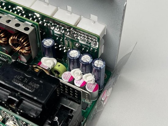 中间则放置了PFC电路的主电容,采用了低纹波、高阻抗、寿命长等特点的 105℃日系主电容。该电容特别适用于对稳定性、可靠性都有较高要求的电路中。在电源大功率输出的情况下,日系电容高耐久的特点可以使用户更加安心地使用。