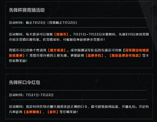 活动期间登录客户端内即可参与“先锋杯竞猜活动”,各种游戏道具和丰厚实物奖励等你来拿!不止如此,更有“口令红包”活动,指定时间在综合聊天频道发送正确口令,就有机会获得【金狮雕像】等各类珍稀奖励!