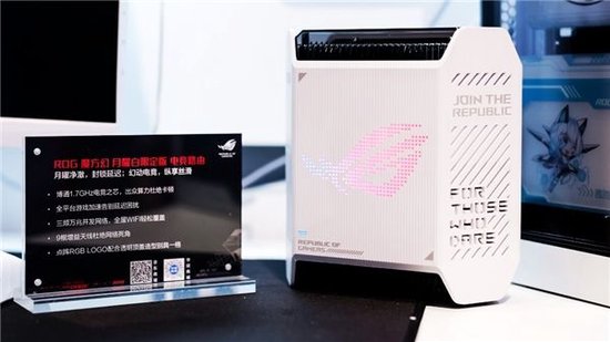不同于以黑色+红色为主题的ROG展区,白色主题的吹雪展台则拥有一种低调内敛的感觉,现身于此的月曜白限定款ROG魔方幻分布式电竞路由也秉承了相同的设计美学,通体雪白的六面柱体外观与正面的点阵式ROG灯效同样令人过目不忘。