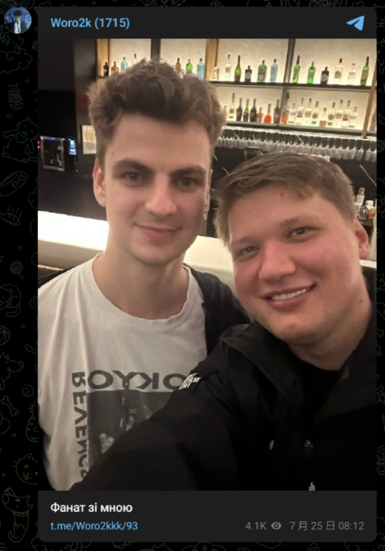 Monte选手Woro2k在telegram上发了一张与s1mple的合影,并且开玩笑称s1mple是他的粉丝。