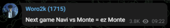 随后Woro2k又发电报表示:“下一场NAVI对阵Monte时,我们会很轻松的拿下。”