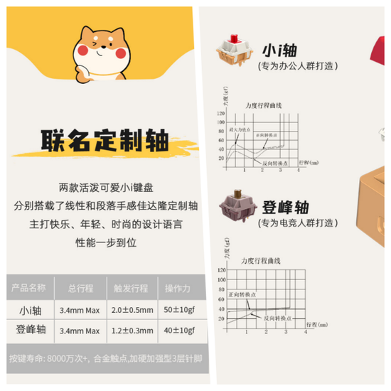 想要一款能满足电竞、编程、办公等诸多场景的专用轴体?别被可爱的小i轴外表欺骗了,总以为敲击不够劲,没想到在“50gf”的压力下,隐藏的是强烈的段落感。具备强段落、轻压力的素质,意犹未尽的指尖体验实属码字输入好搭档。
