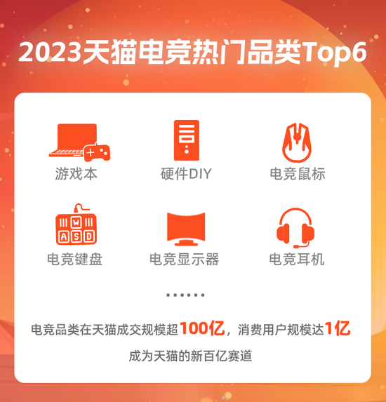 2023年电竞消费的新趋势是,小众细分需求在兴起,天猫618期间,键轴和游戏电视成交增长超100%,键帽等游戏装备增长超70%。当前,游戏本、硬件DIY、电竞鼠标、电竞键盘、电竞显示器、电竞耳机等成为天猫Top6的电竞品类。