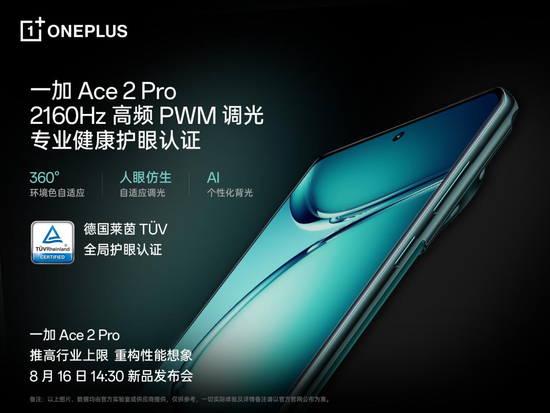 在用户关注的健康护眼方面,一加 Ace 2 Pro 也有所突破。一加Ace 2 Pro 支持 2160Hz 高频 PWM 调光,可以在暗光低亮度下,缓解视觉疲劳。另外,通过 360° 环境色自适应、人眼仿生自适应调光及 AI 个性化背光技术等一系列护眼技术和硬件级低蓝光,为用户提供更为舒适的暗光观感。凭借出色的护眼性能,一加 Ace 2 Pro 获得「莱茵 TÜV 全局护眼认证」,为用户的视觉健康保驾护航。