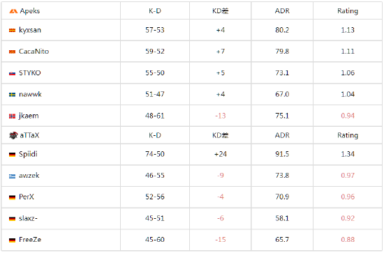 图三Ancient上Apeks的顶梁柱是kyxsan和Martin Styk | STYKO,两人分别有着1.60和1.57的rating。上半场Apeks作为防守方拿下了10分,但韧性极强的德国人并没有轻言放弃。下半场ALTERNATE aTTaX回敬对手一个10-5,将比赛拖入加时。加时赛中ALTERNATE aTTaX越打越勇,以19-16的比分拿下图三。总比分2-1战胜Apeks战队。