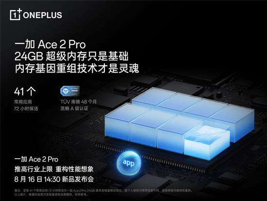 此前,一加 11 与一加 Ace 2 的「内存基因重组」技术受到了媒体和用户的广泛好评,它针对大内存的硬件特性,从系统底层入手,实现业内迄今最彻底的安卓内存底层重构。借助瞬时带宽技术、异步内存技术等技术,进一步确保了大内存发挥更大的性能价值。一加 Ace 2 Pro 聚焦用户最频繁的日常用机场景,全面升级了「内存基因重组」技术,全球首发「全局内存架构」,使得 IO 数据速记读取性能提升 20 倍,大幅提升了应用的启动和运行流畅度。在超大内存+独家自研的「内存基因重组」技术加持下,一加 Ace 2 Pro 24GB版本支持54个常用应用保活,41个常用应用 72 小时持续保活,实现内存体验质的飞跃。同时,一加 Ace 2 Pro 也通过了 TÜV 南德 48个月流畅 A 级认证,能够放心流畅的使用 4 年以上。