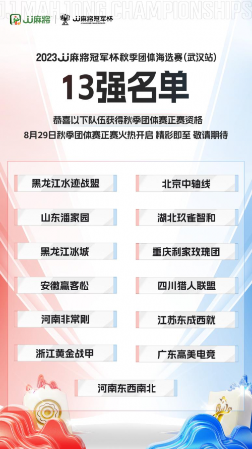 2023JJ麻将冠军杯秋季团体海选赛(武汉站)于8月5日-6日举行,经过两日激战,黑龙江水迹战盟、北京中轴线、山东潘家园、湖北玖雀智和、黑龙江冰城、重庆利家玫瑰团、安徽赢客松、四川猎人联盟、河南非常刚、江苏东成西就、浙江黄金战甲、广东高美电竞、河南东西南北13支队伍成功锁定秋季团体赛正赛席位。