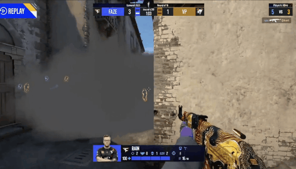 下半场攻防转换,来到进攻方的FaZe开局同样用一个rushB还给VP,轻松收下手枪局。比赛来到下半场第一个长枪局,开局FaZe选择常规默认,总监一马当先控制下水道,ropz也顶住了A2楼近点。由于VP没有对中路进行第二时间的反清,所以FaZe众人很轻易就拿下了拱门的控制权。随着A1的爆弹,FaZe众人直接夹击A区,但是fame却从警家混烟杀出轻松拿下三杀化解了FaZe的进攻!VP收下这一分。