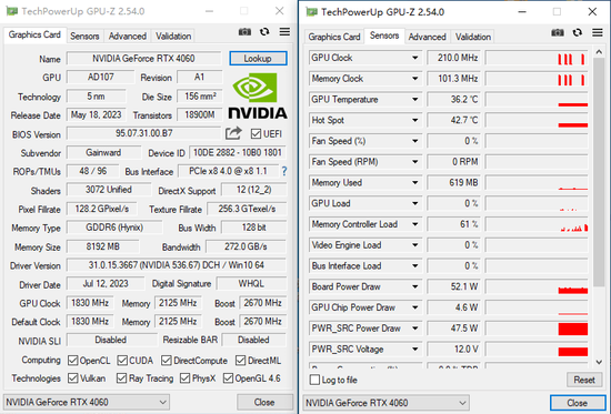 测试功耗使用软件为FurMark,开启其中GPU-Z检测,可以目睹相关产品规格和常温待机温度和功耗。常态待机温度为36.2度,功耗为52.1W。