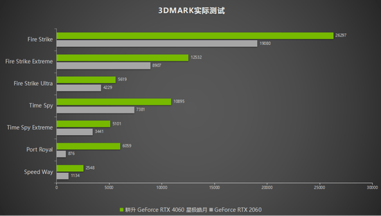 经过以上3DMark测试数据的对比,我们可以清晰地发现,在各项数据上,耕升GeForce RTX 4060星极皓月表现出与GeForce RTX 2060比较大的差异。耕升 GeForce RTX 4060 星极皓月的性能较比GeForce RTX 2060有较大的提升,部分数据甚至可以拉开一个惊人的差距。例如,在Fire Strike测试中,耕升GeForce RTX 4060星极皓月的得分高达26297分。而在Port Royal测试中,耕升GeForce RTX 4060星极皓月的得分为6059分,与GeForce RTX 2060的得分存在显著差异。总的来看,基准测试方面的各项数据显示,耕升GeForce RTX 4060星极皓月相比GeForce RTX 2060的性能提升幅度平均约为40%,成功拉开了与前代显卡之间的性能差距。