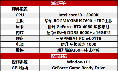 为了充分发挥显卡的潜力,在本次测试中,我们选择了强大的Intel Core i9-12900K作为配套处理器。同时搭配了ROG MAXIMUS Z690 HERO主板,并使用了两条速度为6000Hz的芝奇幻锋戟DDR5 16GB内存。此外,我们还选用了耕升星极破冰1000电源。这套以耕升硬件为基础的测试平台,在各个方面都能满足我们的需求,耕升GeForce RTX 4060星极皓月的性能也将在这个平台上得到完美的展现。