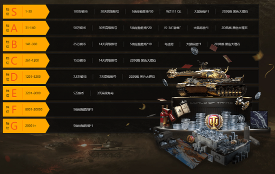 通过页面内各个活动获得的盛典币,将累计至盛典排行榜中,玩家可以查看自己在排行榜中的排名。玩家可根据在排行榜上的排名,赢取对应档位大礼。WZ111 QL 、IS-3A“游隼”、乌达尼与坦克世界定制大鼠标垫等好礼,尽在周年盛典!