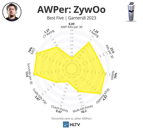 值得注意的是,ZywOo本次赛事的AWP使用率明显下降,但他还是可以进入狙击手行列。ZywOo在游戏中的行动也非常自由,在每30个回合中他有4.6个开局击杀(排名第五),他76%的击杀来自于胜利的回合,考虑到他45%的存活率,ZywOo的发挥无可置疑。