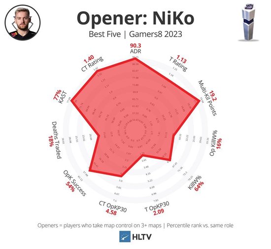 G2没能在石油杯复刻IEM 科隆站的成功,但没人能指责NiKo的发挥。他延续了自己在科隆的表现,以步枪手的身份位列Rating数据帮第二,在ADR(90.3 vs 88.5)、KP30(25.2 vs 24.6),又一次被称为最佳破局者。