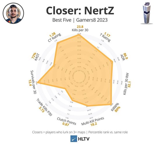 他既是收割者,又是自由人,每30回合有23.8个人头,同时17.6次死亡(最少)。在决赛前六张地图的四张中,他是ENCE队内的MVP,有着平均1.36的rating。
