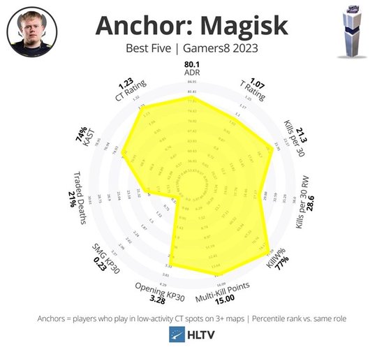 在这项数据上,Heroic选手TeSeS是Magisk的竞争对象。TeSeS是Heroic最耀眼的花火,尤其是在对阵GamerLegion时,他在两张地图上有着出彩的发挥。但TeSeS的数据被这两张地图夸大了。Magisk在半决赛中对阵G2时有着1.18的rating,而TeSeS面对ENCE时并没有同样的发挥。