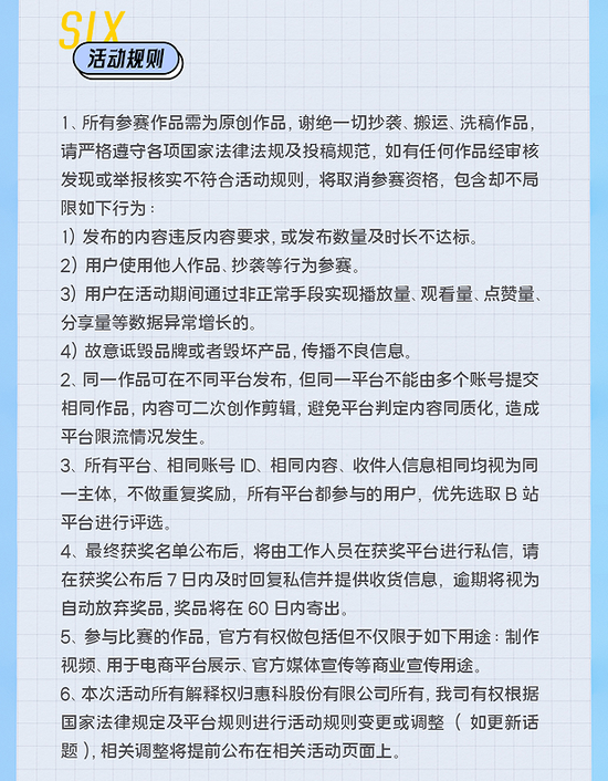 在9月1日至9月14日内容征集的期间,评委会综合视频内容质量及播放量等数据,从所有符合参赛要求的作品中,筛选10位进入用户投票环节,并在@HKC惠科视界B站账号进行最终投票。作品质量会综合画面质量、呈现方式、内容时长和数据表现进行考量,所以想脱颖而出的朋友就要多花心思了。9月18日至9月24日的投票期间,HKC会根据用户的实际投票结果,评选出一等奖、二等奖、三等奖和参与奖,每个ID仅一次投票机会哦~