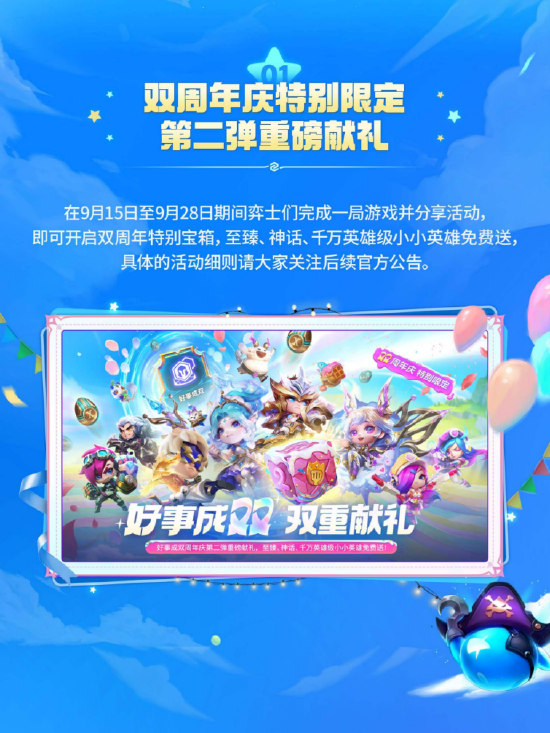 没有中奖的弈士们也不要灰心,游戏内依旧有海量福利在等待大家获取,在9月15日至9月28日活动期间,弈士们只需完成一场对局并动动小手分享活动,即可开启双周年特别限定宝箱。包含大家喜爱的【至臻 剪纸仙灵 小小格温】,【电玩女神 小小凯特琳】等至臻神话级小小英雄,以及千万份英雄级小小英雄都有机会等待着各位弈士们抽取!