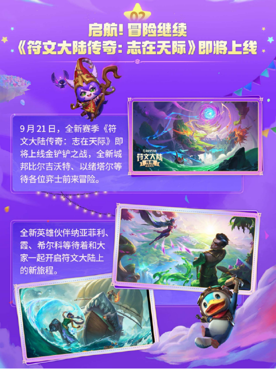 福利到位之后,新赛季也来为“好玩”出一份力。全新赛季符文大陆传奇:志在天际 将在9月21日正式与弈士们见面,新赛季将开启两个全新的城邦,全新的英雄伙伴:纳亚菲利、霞、希尔科等也将和大家一起开启符文大陆上的新旅程。