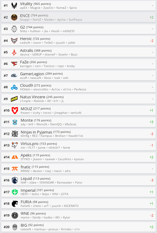 除ENCE升至第二,Heroic跌到第四外,前十变动的还有Ninjas in Pyjamas掉出了前10榜单,MOUZ上升到第10位。 最新前十榜单如下: