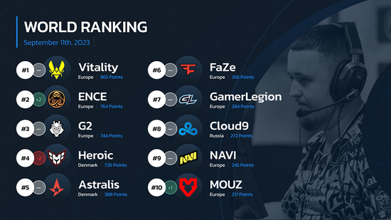 HLTV更新了最新的世界战队排行榜,第一名仍然由Vitality占据,ENCE升至第二,而Heroic跌出前三目前排名第四位。