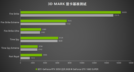 为准确评估显卡的性能,我们使用能够提供准确跑分结果的软件"3D Mark"进行各项基准测试。由于GTX 1660 SUPER没有RT核心,但在GeForce Game Ready 425.31 WHQL驱动之后也能支持光线追踪,因此加入Port Royal项目的测试。从结果来看,耕升GeForce RTX 3050追风8GB显卡在代表DX11游戏性能的FSE和FSU测试中领先GTX 1660 SUPER约1%;代表DX12性能的Time Spy和Time Spy Extreme测试中领先1%;代表光追性能的Port Royal测试中,搭载全新第二代光追单元的耕升GeForce RTX 3050追风8GB显卡的性能超过GTX 1660 SUPER的31%!在所有测试模式中,耕升GeForce RTX 3050追风8GB显卡显著压制NVIDIA GeForce GTX 1660 SUPER显卡,堪称最佳的入门级光追游戏显卡!