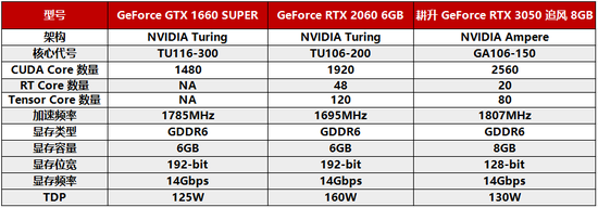 在正式开始测试之前,我们先来对比一下该显卡和上一代RTX 2060显卡的规格参数。耕升GeForce RTX 3050追风8GB显卡与NVIDIA GeForce RTX 2060 6GB相比,CUDA核心数增加30%,达到2560个!显存规格相同,但容量比上一代RTX 2060显卡增加了2GB。而与NVIDIA GeForce GTX 1660 SUPER相比,CUDA核心数增加72%!显存规格相同,但容量比NVIDIA GeForce GTX 1660 SUPER显卡增加2GB。