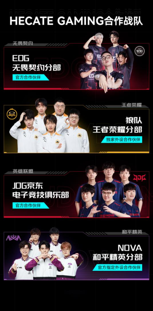 此次HECATE与上海NOVA和平精英战队、EDG无畏契约分部强强联手,开启战略合作新旅程,不仅代表着HECATE在电竞领域的进一步深度布局,也为电竞产业赋予了新兴力量,将“探索新竞界”的品牌精神推向全新高度。
