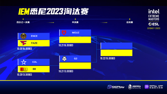 休息一日,IEM 悉尼站淘汰赛将于10月20日13:30开始。首战为COL对阵BB战队,接着是FaZe迎战ENCE。总决赛将于10月22日的15:30进行,赛制为BO3。