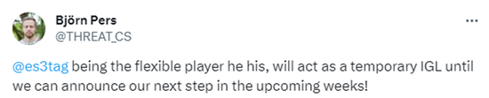 “es3tag作为一个比较全能的选手,他将担任临时的指挥工作,直到我们在未来几周内可以宣布下一步行动!”