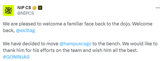 Ninjas in Pyjamas俱乐部在官方推特宣告了下放hampus,es3tag回归首发阵容的消息。