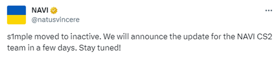 “s1mple进入不活跃状态,我们将在几天后公布NAVI的阵容更新,请保持关注!”