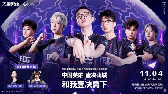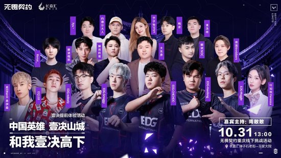 虽然这一预热活动已经圆满落幕,但“中国英雄,壹决山城”的活动才刚刚开始:从11月1日至11月5日期间弹子石老街神秘挑战者持续空降中,每天都有不同神秘嘉宾到场与参与玩家持续互动,并与玩家进行挑战赛或当日活动。其中,11月4日,EDG全队将“满员空降”,想要挑战这些巅峰选手的玩家们,可要抓住这次机会。