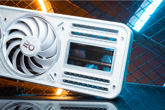 影驰 20周年 GeForce RTX 4090此次的组成也极具特色。风扇分为正反两面放置。显卡正面设有2个同样大小的100MM*2环形20周年专属风扇,加强核心动态频率的提升幅度的同时静音稳定。而背面采用了90MM环形风扇进行散热,实现抽风以及无阻挡散热!达到高速的进出风循环,增大进风量进一步稳定显卡温度。风扇均支持智能启停技术,降温控制显卡温度的同时,能够给与玩家一个优异的静音游戏环境。